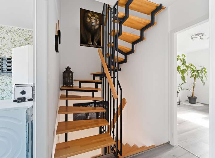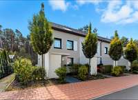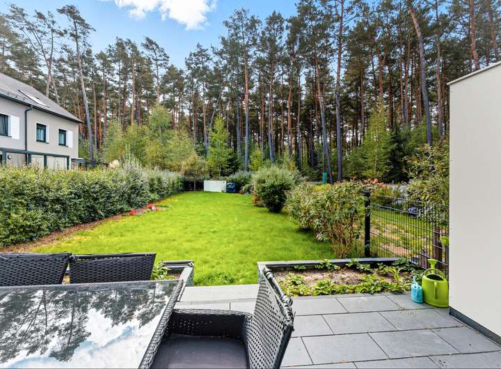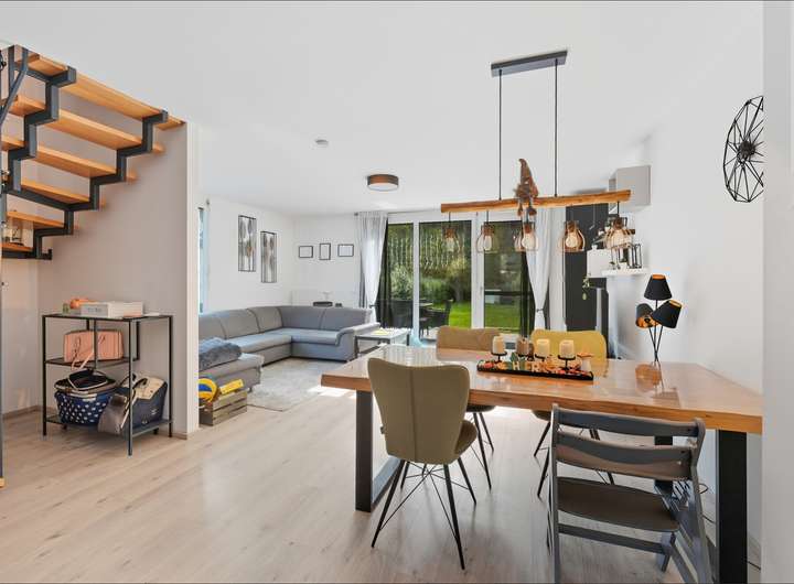 Die Grundstücksfläche umfasst circa 400 Quadratmeter, die Wohnfläche etwa ca. 120 Quadratmeter. Das Haus erstreckt sich über drei Etagen – Erd- und Obergeschoss sowie ein Dachgeschoss – wodurch sich helle, großzügige Räume ergeben. Im Erdgeschoss eröffnen sich ein Wohnbereich mit offener Küche sowie direktem Zugang zur Terrasse, von der aus man einen Blick auf den großen Garten und den angrenzenden Wald hat. Drei Schlafzimmer bieten ausreichend Platz für Familie und Gäste, während zwei Bäder, eines im 1. Obergeschoss und ein weiteres im Dachgeschoss zusätzlichen Komfort bieten. Die Terrassentür ermöglicht direkten Zugang zum ruhigen Gartenbereich, der individuell genutzt werden kann und zu entspannten Stunden im Freien einlädt. Eine neuwertige Einbauküche ist im Preis enthalten. Zwei PKW-Stellplätze gehören zum Haus.