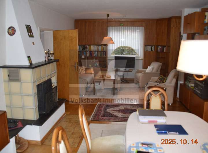 Die Wohnung im Erdgeschoss bietet ein helles Wohnzimmer mit Kamin und Zugang zur sonnigen Südterrasse – ideal zum Entspannen und Wohlfühlen.