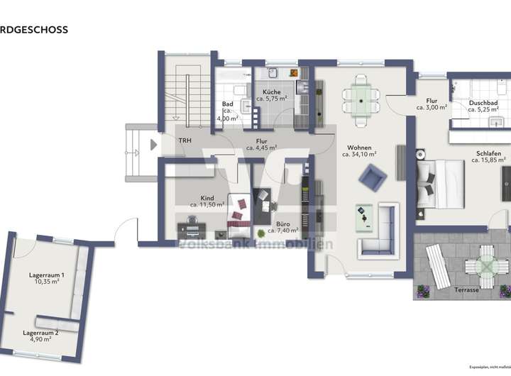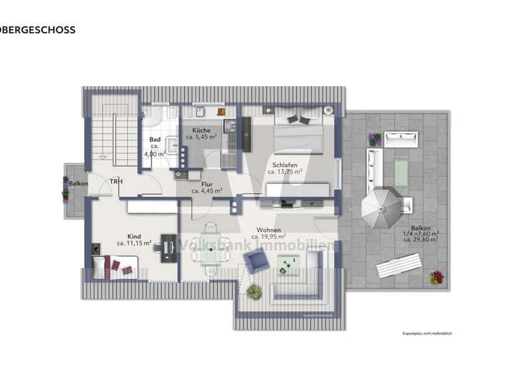Die Wohnung im Obergeschoss verfügt über einen Balkon bzw. eine großzügige Dachterrasse mit einer Grundfläche von ca. 30 m².