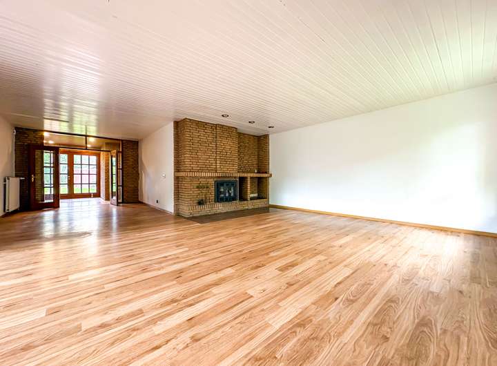 Schon beim Betreten spürt man die besondere Atmosphäre dieses Hauses: Großzügige Räume, warme Materialien und liebevolle Details schaffen ein Zuhause, das zum Ankommen und Wohlfühlen einlädt. Das Herzstück bildet das weitläufige Wohnzimmer im Erdgeschoss – lichtdurchflutet, mit edlem Vinylboden, charmanten Flügeltüren und einem Kamin, der an kühlen Tagen für Behaglichkeit sorgt. Hier genießen Sie entspannte Stunden mit Familie oder Freunden, während Sie durch große Fenster den Blick ins Grüne schweifen lassen.