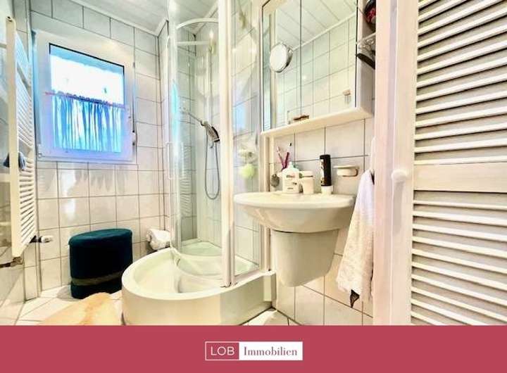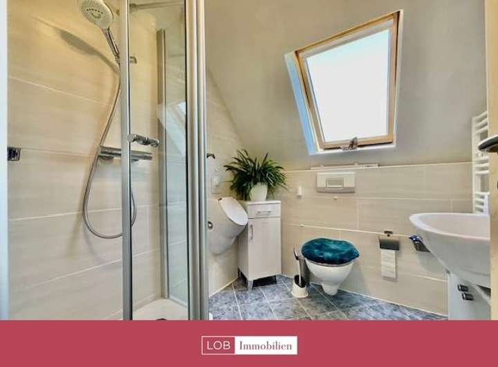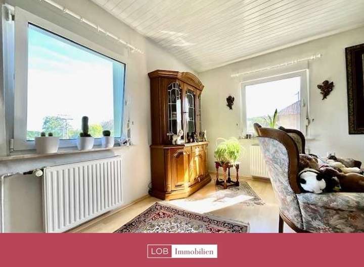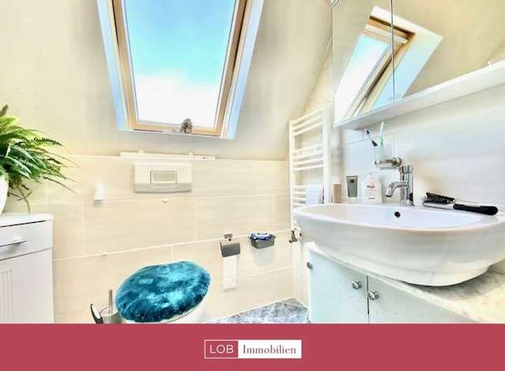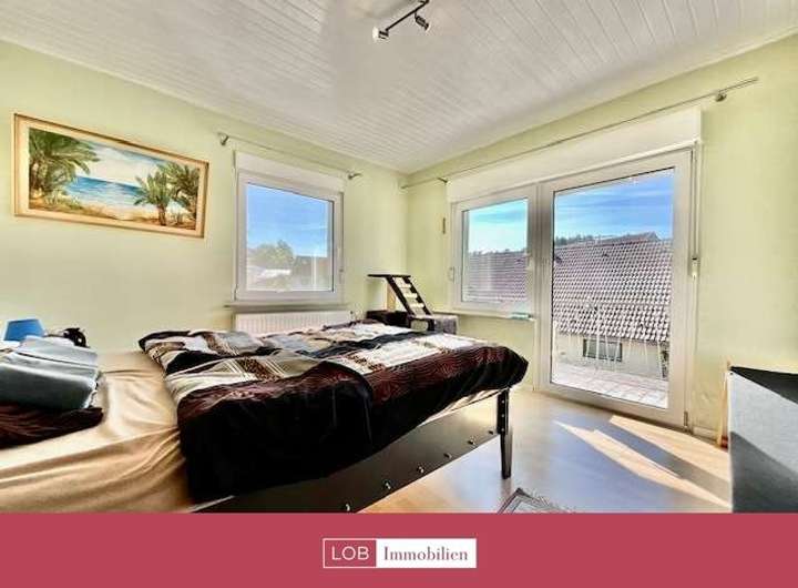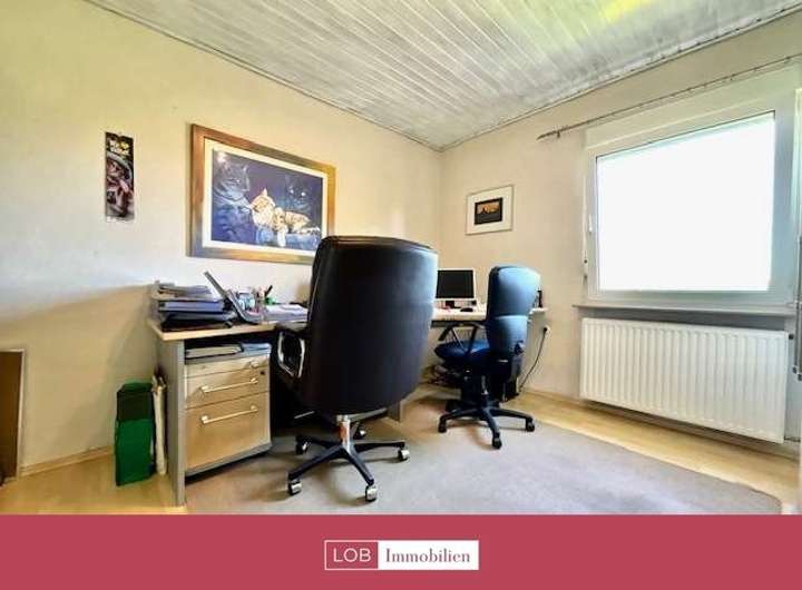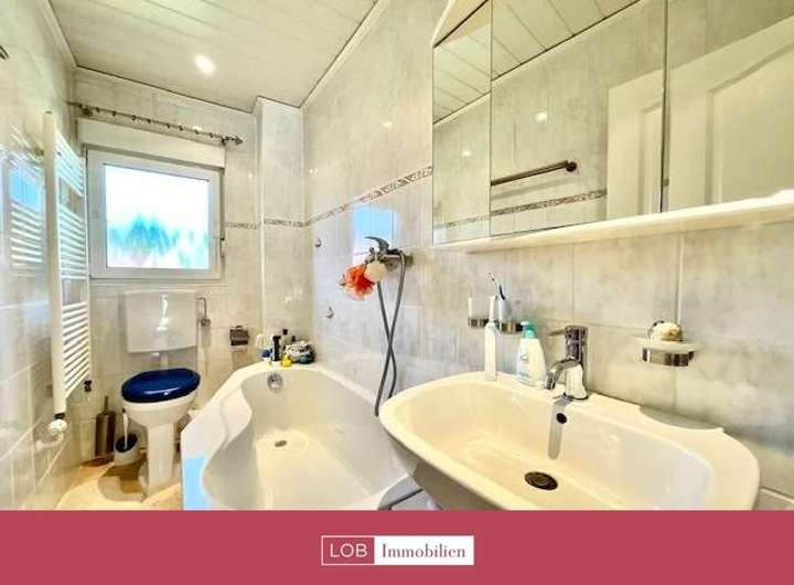 Im Obergeschoss befindet sich ein weiteres Badezimmer, ebenfalls mit Badewanne und WC. Zwei geräumige Schlafzimmer bieten viel Platz und Rückzugsmöglichkeiten. Ein zusätzliches Büro sowie ein Gästezimmer mit Balkon runden das Raumangebot auf dieser Etage ab.