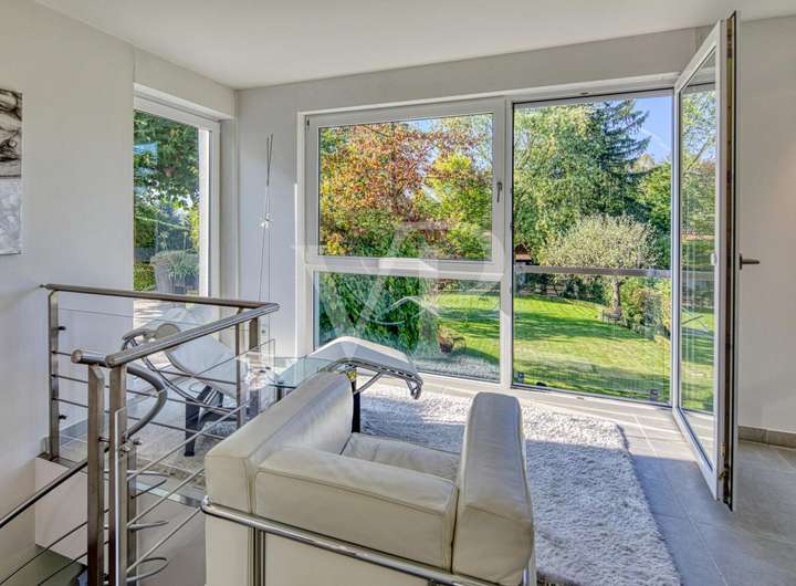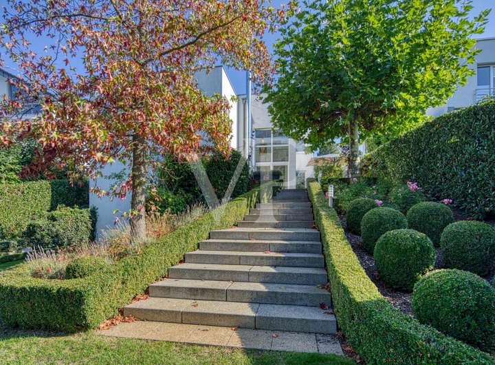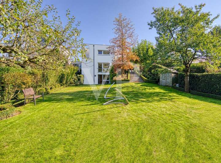Diese moderne Immobilie, 1997 in ruhiger Lage auf einem ca. 1.000 qm Grundstück kernsaniert und erweitert, überzeugt mit klarer Architektur, Großzügigkeit und einem herrlich weitläufigen Garten.