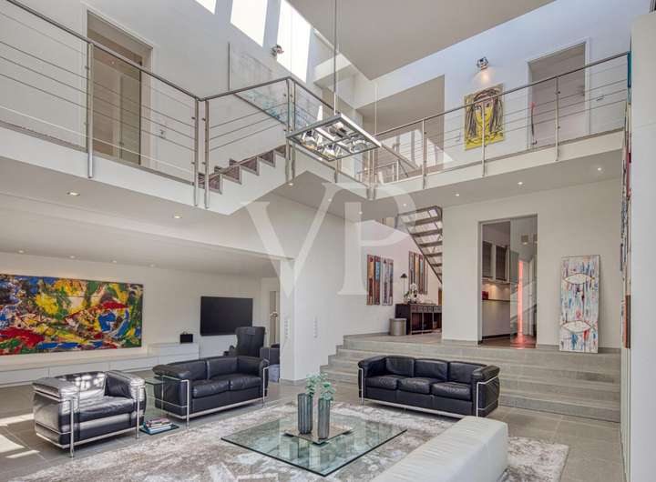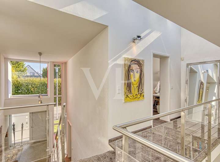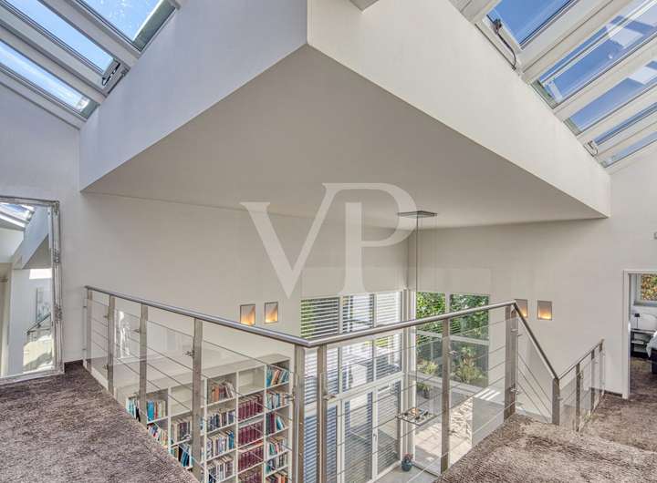 Die Wohnfläche von ca. 250 qm verteilt sich auf drei Etagen und bietet lichtdurchflutete Räume mit bodentiefen Fensterfronten sowie einer großen Fensterdachkonstruktion.