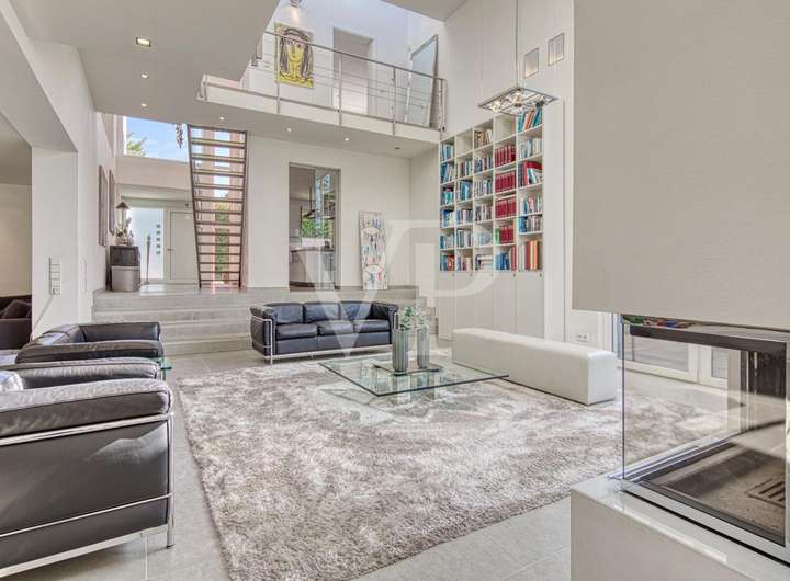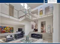 Das stilvolle Entrée mit separatem Garderobenbereich sowie Gäste - WC und Blick auf den Treppenaufgang zur Galerie führt in den imposanten Wohnbereich mit Designkamin, Essplatz und gemütlicher Lounge-Ecke. Von hier gelangt man über eine stylische Wendeltreppe in die Büroetage. Hohe Decken, klare Linien und eine offene Raumgestaltung schaffen eine einladende