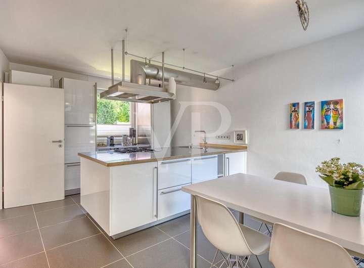 Nahtlos - nach Bedarf mit einer Glasschiebetüre zu schließen - gelangt man vom Wohnraum in die hochwertige Bulthaup - Küche mit Gasherd. Von hier kommt man ebenso zur großen Terrasse mit Sitzplatz. Ein Hauswirtschaftsraum mit einer kleinen Küche und ein Hobbyraum bzw. Abstellraum ergänzen das Erdgeschoss.
