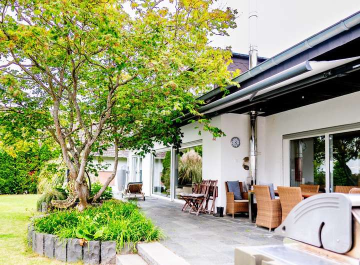 Besonderes Highlight der Immobilie ist die moderne Außenanlage. Der beheizbare Außenpool mit Gegenstromanlage lädt zu sportlicher Betätigung wie auch zur Erholung ein und wird ergänzt durch eine Außendusche sowie die neue Bepflanzung, die dem Garten ein gepflegtes Erscheinungsbild verleiht. Die überdachte Terrasse mit Markise erweitert in den Sommermonaten den Wohnraum ins Grüne. Eine praktische Gartenhütte bietet zusätzlichen Stauraum.