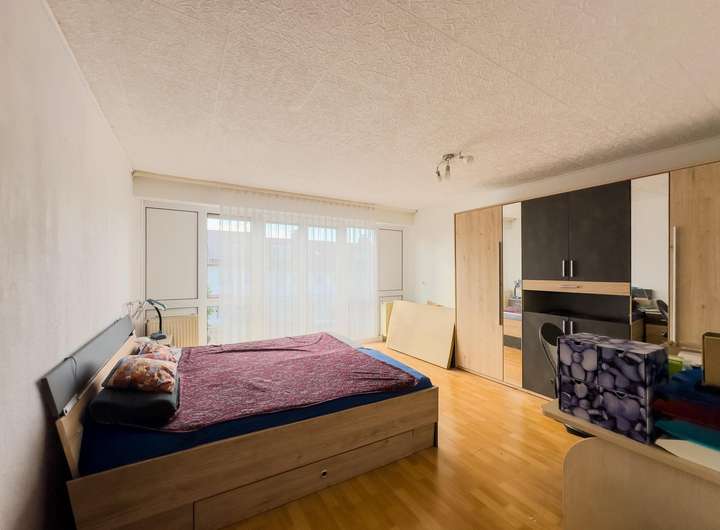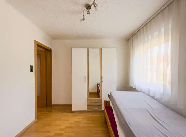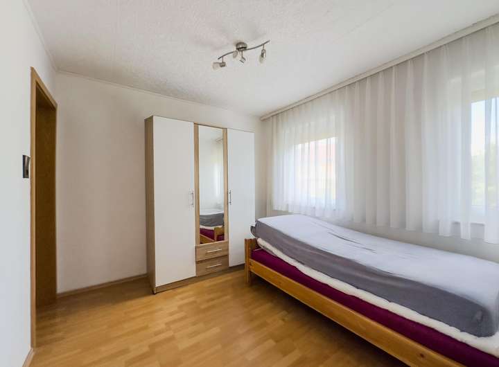 Im Obergeschoss erwartet Sie das großzügige Schlafzimmer mit großer Fensterfront, ein separates WC sowie ein Kinderzimmer, das sich ebenso gut als Arbeits- oder Gästezimmer nutzen lässt.