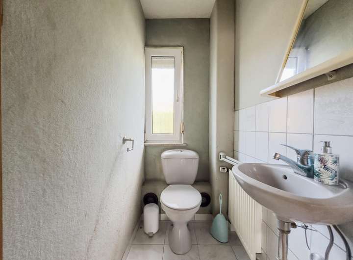 Das Untergeschoss beherbergt das Badezimmer sowie einen potenziellen Wasch- und Trockenraum. Von hier aus gelangen Sie über eine Treppe direkt zum Garten.