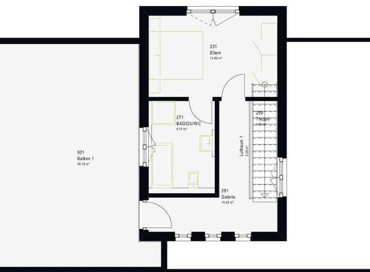 Durch seine abwechslungsreiche Geometrie gewinnt das LifeStyle 19.04 F einen extravaganten Charme: Drei versetzt nebeneinander gestellte Flachdächer in unterschiedlichen Höhen formen dieses außergewöhnliche Einfamilienhaus. Mit seinen großzügigen 194 m² Nettogrundfläche (nach DIN 277) bietet das LifeStyle 19.04 F Familien mit Platzbedarf viel Raum zum Wohnen: Auf das Erdgeschoss mit 109 m² (nach DIN 277) verteilen sich in ansprechender Aufteilung zwei Kinderzimmer, der Wohn- und Essbereich mit offener Küche, eine Speisekammer, ein Duschbad, das Gäste-WC sowie Flur und Hauswirtschaftsraum. Der leicht zurückversetzte Hauseingangsbereich schützt zugleich vor Wind und Wetter. Das Obergeschoss nimmt das Elternschlafzimmer, das zweite Bad sowie den Flur auf - und besticht durch den fast 46 m² (nach DIN 277) großen Balkon, der das Gefühl von purem Luxus erzeugt. Die Flachdachkonstruktion des Einfamilienhauses LifeStyle 19.04 F macht’s möglich. Die besondere Architektursprache der drei Flachdächer überzeugt auch durch die Wahl der Fensterformen: Schmale Elemente wechseln sich mit breiten Doppelflügeln ab, sehr viele Fenster sind bodentief ausgeführt - für eine wohngesunde Raumatmosphäre mit viel Licht, gebaut in nachhaltiger Weise.