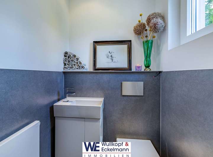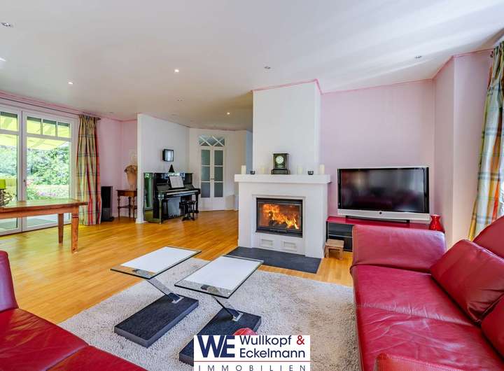 Im Erdgeschoss empfängt Sie eine helle, einladende Diele, die genügend Platz für eine Garderobe bietet und den ersten Eindruck von Großzügigkeit vermittelt. Hier befindet sich auch ein modernes Gäste-WC. Von dort gelangt man entweder in die Küche oder direkt in den offenen Ess- und Wohnbereich. Die großzügige Küche im eleganten Landhausstil lässt sich bei Bedarf durch eine Schiebetür vom Essbereich trennen und überzeugt mit optimaler Aufteilung, einer erhöhten Arbeitsfläche, hochwertigen Miele- und Liebherr-Geräten sowie einer großzügigen Induktions-Herdplatte – ein Raum, der sowohl funktional als auch einladend ist. Das gesamte Erdgeschoss profitiert von einer Deckenhöhe von 2,65 m (im abgehängten Zustand), die den Räumen eine besondere Weite verleiht. Im Wohnbereich sorgt ein Kamin für wohlige Wärme und eine behagliche Atmosphäre. Besonders eindrucksvoll ist der westlich ausgerichtete Wintergarten (Glaspavillon) mit vollständig verschiebbaren Glaswänden und integrierter Unterglasmarkise – von hier öffnet sich der direkte Zugang zur großzügigen Sonnenterrasse, die zum Entspannen und Genießen im Freien einlädt. Ergänzt wird das Erdgeschoss durch einen ruhig gelegenen Arbeitsbereich, der sich hervorragend als Homeoffice eignet.