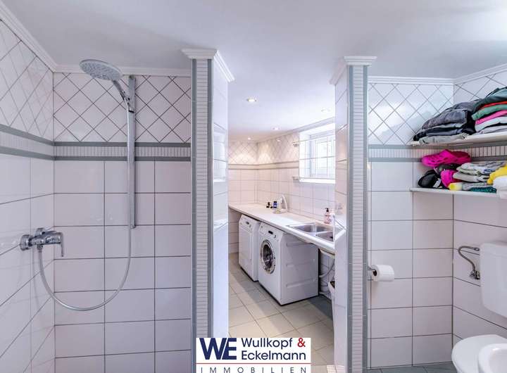 Das Haus ist vollständig unterkellert und bietet neben reichlich Abstellfläche eine praktische Waschküche sowie weitere Räume, die sich ideal als Hobbykeller, Werkstatt oder Lagerfläche nutzen lassen. Zudem besteht hier die Möglichkeit, einen stilvollen Weinkeller einzurichten. Ergänzt wird das Untergeschoss durch ein zusätzliches Duschbad, das den Nutzwert des Hauses noch einmal deutlich erweitert.
