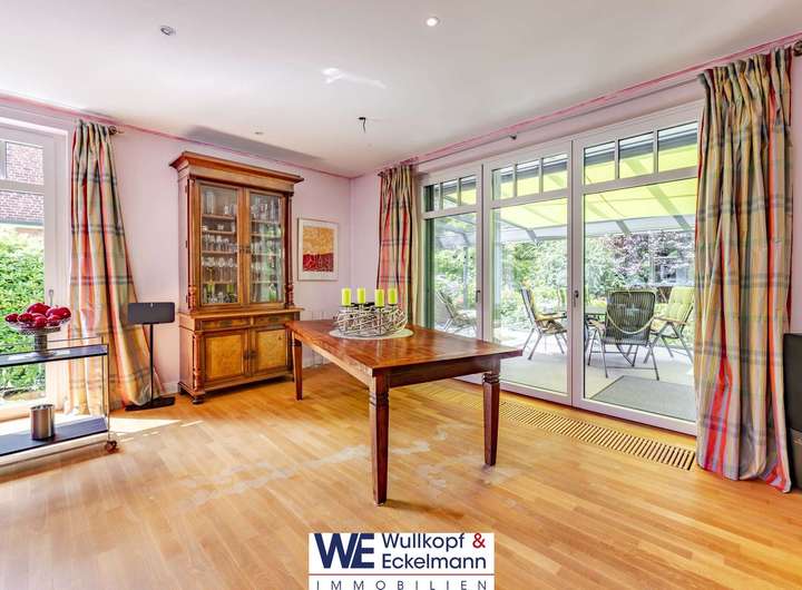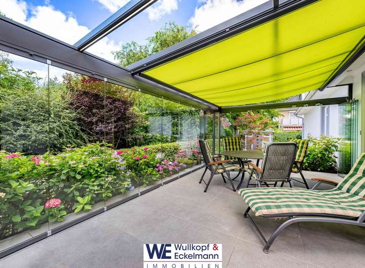 Die äußere Erscheinung ist charmant und repräsentativ, während sich im Inneren ein gut durchdachtes Raumkonzept mit lichtdurchfluteten Bereichen, stilvollen Details und wertiger Substanz entfaltet. Besonders eindrucksvoll ist der zur Westseite ausgerichtete Wintergarten (Glaspavillon) mit vollständig verschiebbaren Glaswänden, einer integrierten Unterglasmarkise und direktem Zugang zur großzügigen Sonnenterrasse – ein fließender Übergang zwischen Innen- und Außenraum, ideal für entspannte Nachmittage und Abende.