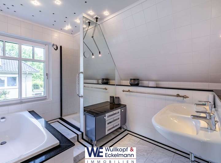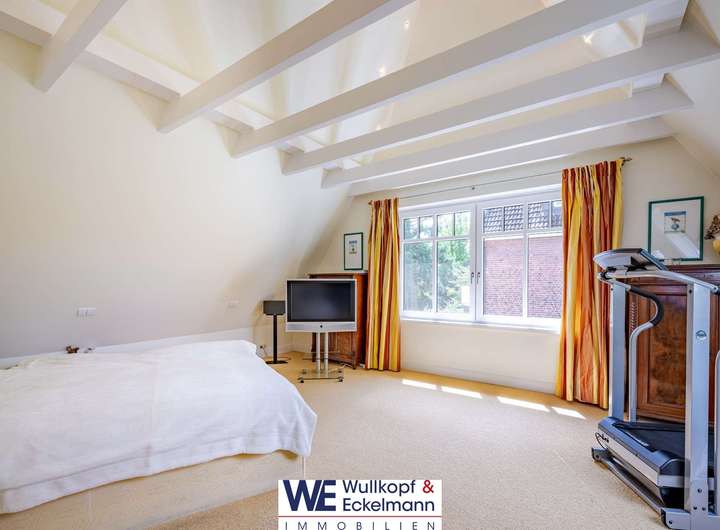 Im Obergeschoss erwartet Sie das eindrucksvolle Hauptschlafzimmer mit ca. 28 m² Fläche. Die bis in den Spitzboden geöffnete Decke schenkt dem Raum außergewöhnliche Höhe und ein Gefühl von Großzügigkeit. Abends sorgt eine integrierte Sternenhimmel-Lichtinstallation für eine ganz besondere Stimmung, während die Klimaanlage zusätzlichen Komfort bietet. Zwei weitere Zimmer mit ca. 18 m² und ca. 10 m² eröffnen vielseitige Nutzungsmöglichkeiten – ob als Kinder-, Gäste- oder Ankleidezimmer. Ein helles Tageslicht-Vollbad mit Badewanne und separater Dusche rundet diese Etage harmonisch ab.