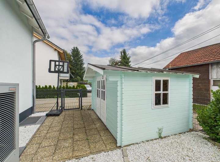 The garden is low-maintenance and offers plenty of room for relaxation and enjoyment. The brick-built pool (approx. 5 × 3 m) with comfortable step entry provides refreshment on warm days. A small fire pit invites you to spend cosy evenings outdoors, and a garden shed offers space for tools and equipment. For children, there is a small play area, making the garden a place of recreation and shared moments.