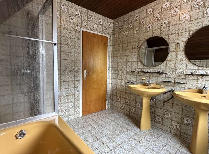 + Bad mit Wanne und Dusche sowie zwei Waschbecken und getrenntem WC