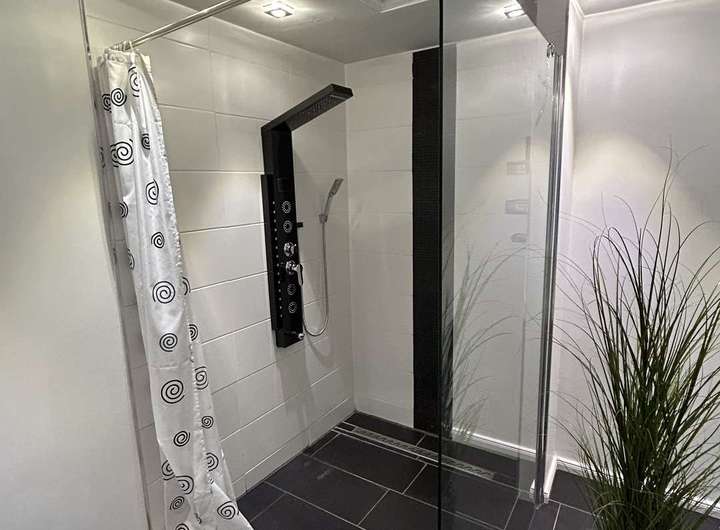 Ein besonderes Highlight ist die voll ausgestattete Einbauküche, die mit modernen Geräten und ausreichend Arbeitsfläche überzeugt und das große Badezimmer mit Dusche und Whirlpool. Der Kamin im Wohnbereich schafft eine gemütliche und einladende Atmosphäre an kühleren Abenden.
