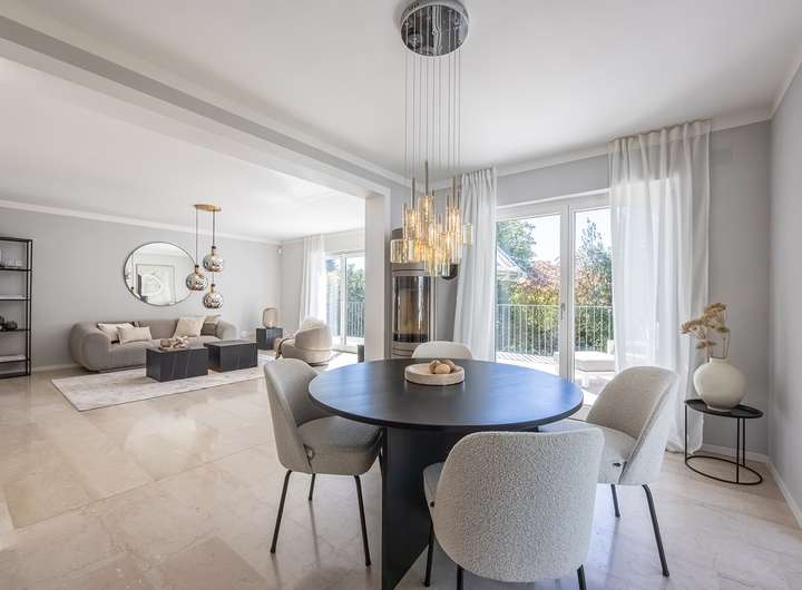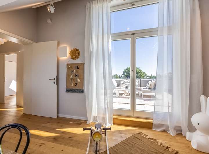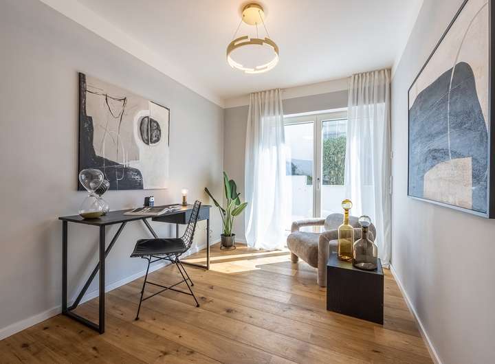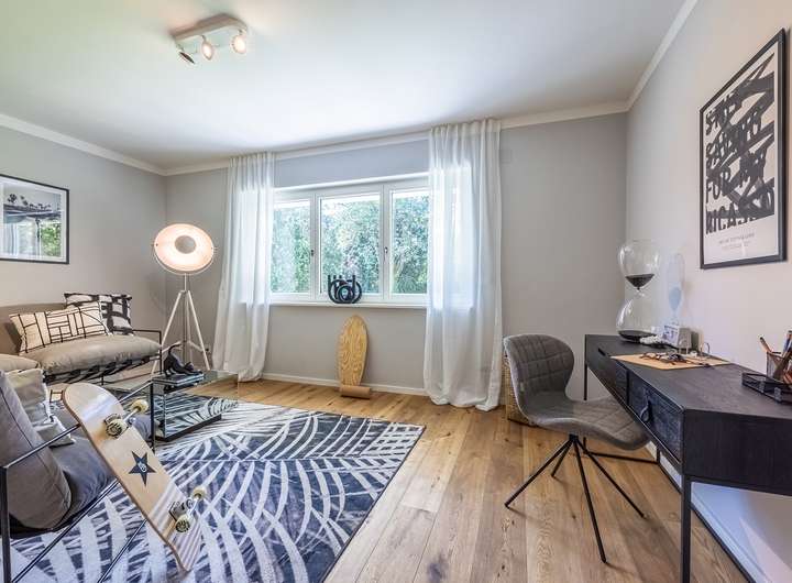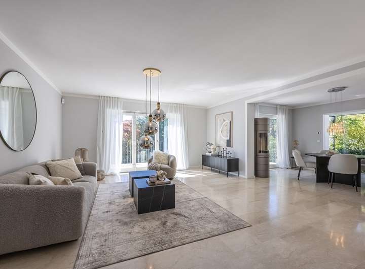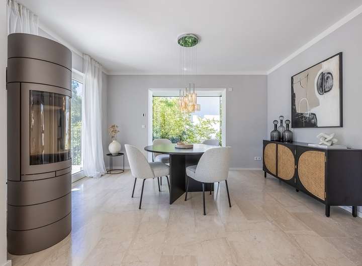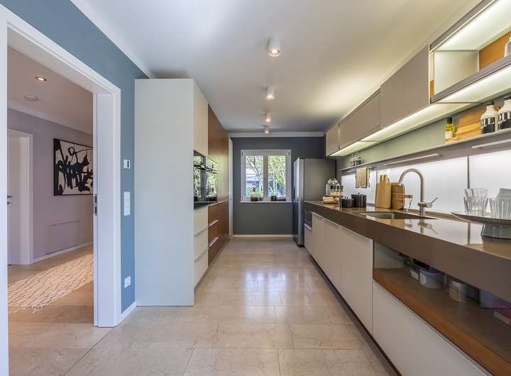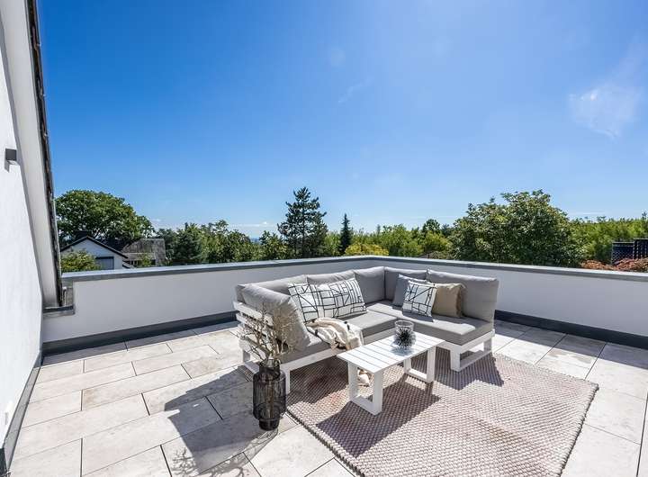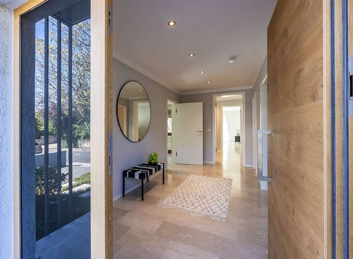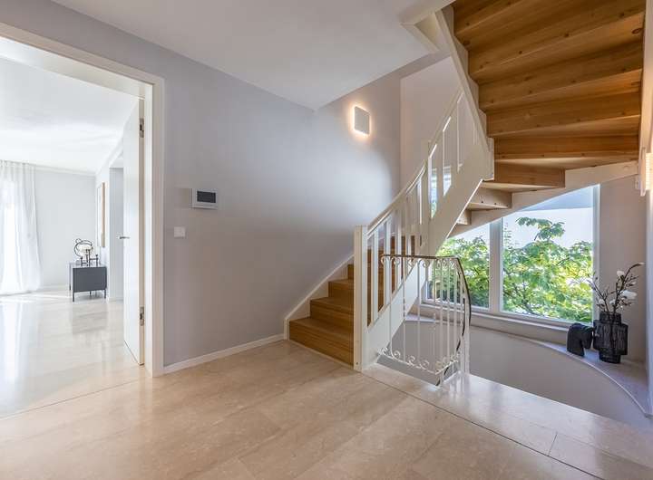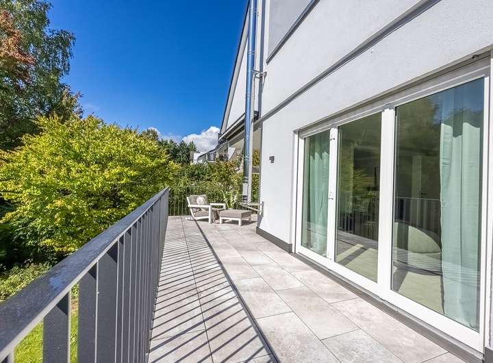 In einer der begehrtesten und naturnah gelegenen Villenlagen im Maasgrund präsentiert sich dieses neuwertige, mit viel Liebe zum Detail kernsanierte Familiendomizil. Der durchdachte Grundriss in Verbindung mit hochwertigen Materialien bildet den idealen Rahmen für Familien und Paare, die Wert auf Stil und Exklusivität legen – einziehen und und wohlfühlen! Die perfekte Sonnenausrichtung durchflutet das gesamte Haus mit viel Licht. Bodentiefe Fenster geben den Blick ins Grüne frei und schaffen eine harmonische Verbindung zwischen Innen und Außen. Ein großzügiges Faltschiebefenster sowie ein Panorama-Lesefenster unterstreichen das besondere Wohngefühl. Der weitläufige Wohn- und Essbereich mit Kamin sorgt für eine einladende Atmosphäre und lädt zu entspannten Stunden mit Freunden und der Familie ein. Design und Funktionalität vereint die moderne Poggenpohl-Küche mit Kochinsel, die für jeden Hobbykoch zum Lieblingsplatz wird. Zusätzlichen Komfort bietet das großzügig geschnittene Garderobenzimmer, während das stilvolle Gäste-WC das Raumangebot im Erdgeschoss abrundet. Eine elegante Holztreppe führt ins Obergeschoss, in dem sich das bis zum Giebel geöffnete Elternschlafzimmer mit geräumiger Ankleide und modernem Bad befindet. Ein charmantes Kinderzimmer sowie eine beeindruckende Dachterrasse mit Weitblick laden zum Verweilen und Träumen ein. Im Gartengeschoss erwarten Sie drei weitere, gut gestaltete Zimmer und ein modernes Bad, die sich ideal als Kinder-, Arbeits- oder Gästezimmer eignen. Im ganzen Haus sorgt eine Fußbodenheizung für angenehme Wärme und Wohlbefinden. Der liebevoll angelegte Garten garantiert Privatsphäre und Ruhe und wird dank automatischer Bewässerung, stimmungsvoller Beleuchtung und Mähroboter zur pflegeleichten Wohlfühloase. Ein modernes Design-Vordach mit steuerbarer LED-Beleuchtung setzt architektonische Akzente, während eine Alarmanlage die Sicherheit bietet.