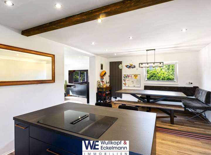 - Haupteinheit (ca. 130 m²): Zwei Etagen, 6 Zimmer, moderner Wohn-/Essbereich, offene Küche