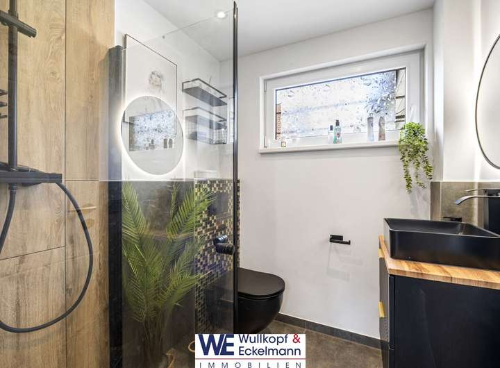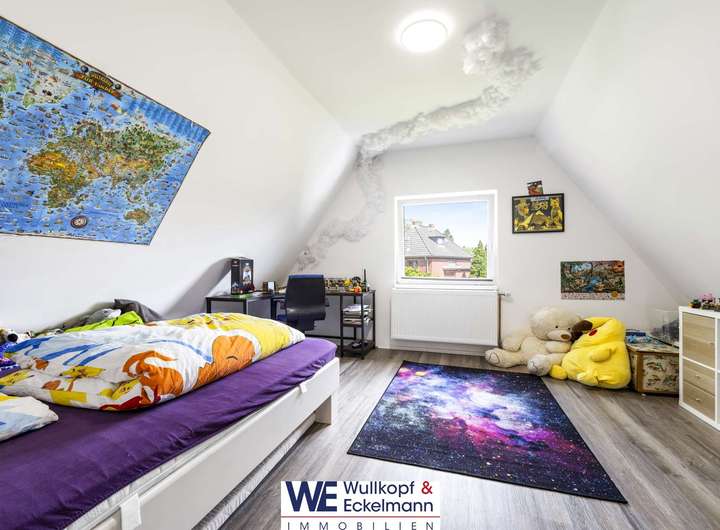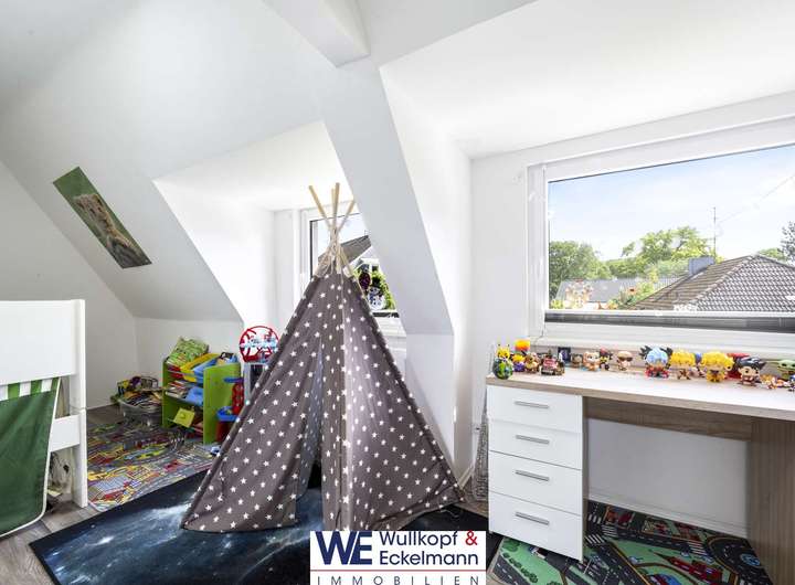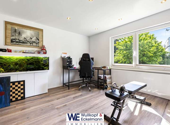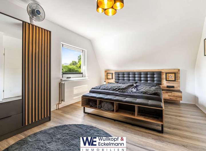 Im Obergeschoss befinden sich das großzügige Elternschlafzimmer, ein stilvolles Bad mit Walk-in Dusche sowie drei weitere Zimmer, die sich hervorragend als Kinder-, Gäste- oder Arbeitszimmer eignen – perfekt für Familien mit mehreren Kindern oder dem Wunsch nach Homeoffice-Möglichkeiten.