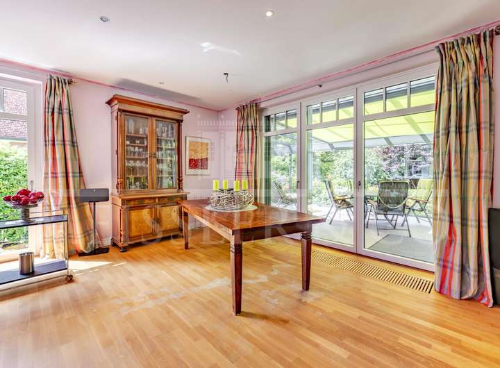 Das Haus wurde laufend in Stand gehalten und befindet sich in einem sehr gepflegten Zustand. Die Küche präsentiert sich sehr gepflegt im Landhausstil mit optimaler Aufteilung. Erwähnenswert sind die erhöhte Arbeitsfläche, die hochwertigen Miele- sowie Liebherr-Geräte und die großzügige Induktions-Herdplatte. Die Bäder sind funktional, bieten jedoch Potenzial für individuelle Modernisierungen, um dem Haus eine noch persönlichere Note zu verleihen. Diese eindrucksvolle Immobile ist vollunterkellert und bietet Ihnen im Obergeschoss drei geräumige Schlafzimmer.