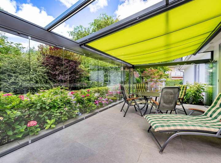 Besonders eindrucksvoll ist der zur Westseite ausgerichtete Wintergarten (Glaspavillon) mit vollständig verschiebbaren Glaswänden, einer integrierten Unterglasmarkise und direktem Zugang zur großzügigen Sonnenterrasse – ein fließender Übergang zwischen Innen- und Außenraum, ideal für entspannte Nachmittage und Abende.