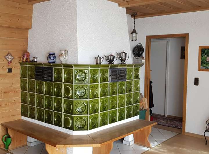 Zentraler Mittelpunkt bildet ein üppiger Kachelofen. Mit diesem kann das Haus neben der üblichen Zentralheizung sehr kostengünstig beheizt werden.