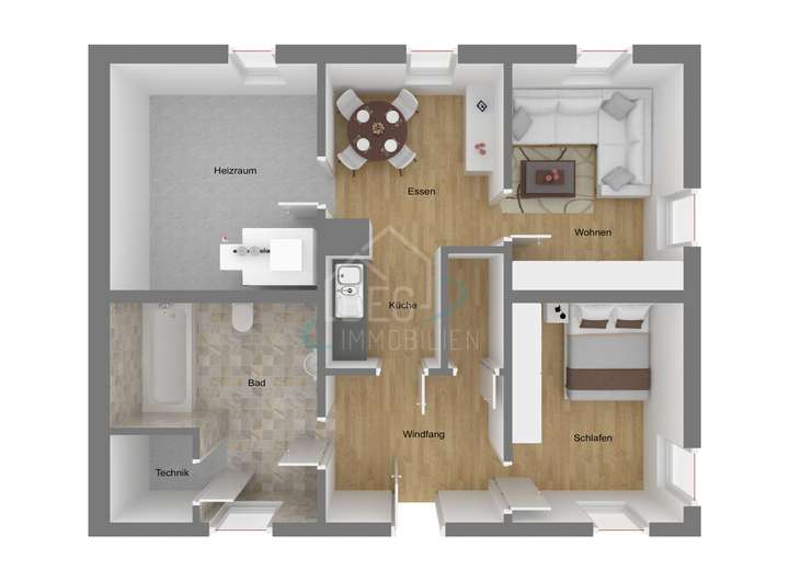 - Tageslichtbad mit Badewanne, WC und Waschmaschinenanschluss