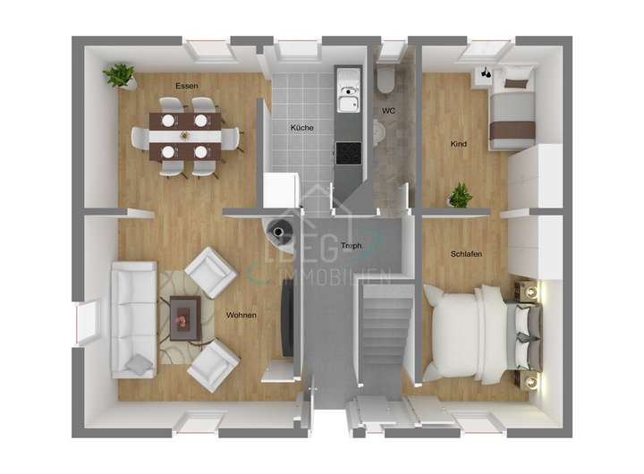 Im Erdgeschoss befindet sich ein gemütliches Schlafzimmer mit angrenzendem Ankleidezimmer, das für zusätzlichen Komfort sorgt. Der großzügige Wohn- und Essbereich bietet ausreichend Platz für gemeinsame Stunden und geht fließend in die Küche über. Der kleine Gartenbereich auf der Rückseite des Grundstücks rundet das Wohnkonzept ab und bietet Raum für Erholung im Freien.