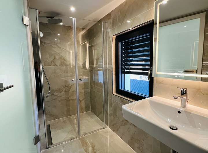 In Bad und WC wird nur hochwertige Sanitärkeramik von Villeroy & Boch eingebaut mit Wassersparenden Markenarmaturen von Grohe. Eine Badewanne und eine Bodengleiche Dusche runden das Angebot ab.