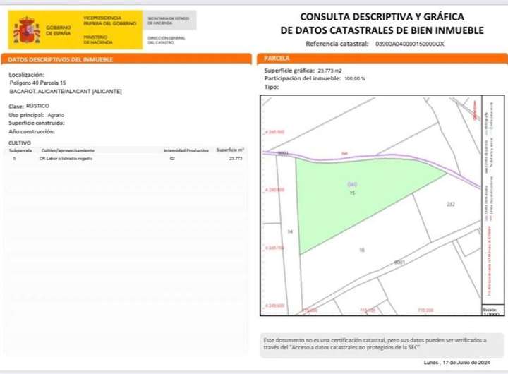 Parcela de terreno rustico con una superficie de 39,783 m2. %%LINE%% Instalaciones de uso exclusivo en la parcela. %%LINE%%Cuando las instalaciones: %%LINE%%se emplacen en una parcela en la que no exista ningún otro uso ni se desarrolleninguna otra actividad, los parámetros de edificabilidad serán lossiguientes: • Parcela mínima de 39,783 m2. • Ocupación máxima del 50%, para la instalación fotovoltaica y otrasconstrucciones que fueran necesarias. • Altura máxima de la instalación de 6 m. • Retranqueos mínimos: 25 m. a eje de caminos y 10 m. al resto de linderos. Se deberá destinar al menos el 50% de la superficie de la parcela a cultivo oarbolado, o, en su defecto, manteniéndola en su estado natural, siendo ellode especial importancia en la franja de retranqueo, a fin de conseguir sumáxima integración en el paisaje. Para la ocupación de las placas fotovoltaicas, a los efectos de sucuantificación, se computará la superficie del área definida por el perímetroenvolvente de la instalación. También en la parcela se pueden realizar construcciones de actividad industrial, logistica con una edificabilidad del 50% con una altura máxima de la edificaciones de 6 metros de altura y retranqueos de 20 metros al eje de carreteras así como de los linderos. Otras actividades permitidas con una edificabilidad del 20% con una altura máxima de la edificaciones de 3 plantas y/o 10 metros y retranqueos de 10 metros al eje de carreteras así como de los linderos serian Vivienda Unifamiliar Aislada, Alojamiento Rural, Camping, Centro de Jardinería, Centro Hípico, Centro al aire libre recreativo/deportivo, Parking descubierto para todo tipo de vehículos/maquinaria, Huerto Agrícola, Huerto Solar. Para cualquier actividad es necesario la obtención por parte del Ayuntamiento del Certificado de Compatibilidad Urbanística y Licencia Municipal. %%LINE%%El presente documento tiene carácter meramente informativo, orientativo y no vinculante por lo que no supone información contractual alguna, siendo su uso estrictamente comercial.