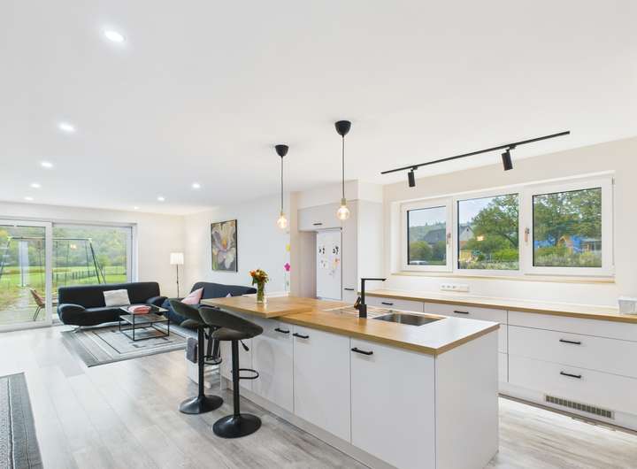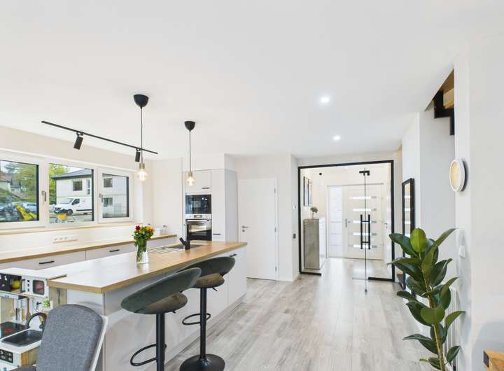 Die Immobilie besticht durch ihre massive Bauweise und die Energieeffizienzklasse A, realisiert durch eine moderne Wärmepumpe und vollflächige Fußbodenheizung in allen Räumen. Sämtliche Zimmer sind mit LAN-Anschlüssen ausgestattet, was optimale Voraussetzungen für Arbeiten im Homeoffice schafft.