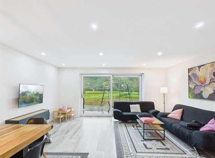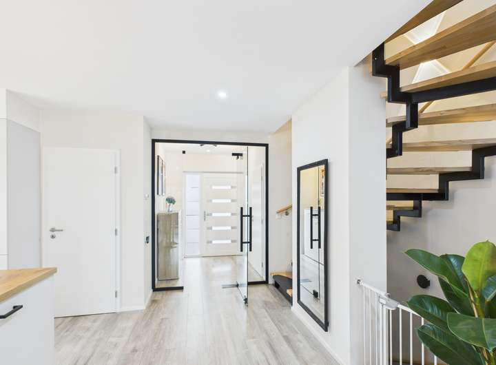 Das Hauptgeschoss überzeugt mit einem großzügigen Wohn- und Essbereich und direktem Zugang zur rund 32 m² großen Terrasse mit Blick ins unverbaute Grüne. Im Obergeschoss erwarten Sie drei Schlafzimmer, ein modernes Tageslichtbad, ein separates Home-Office mit Bad en Suite sowie ein rund 15,44 m² großer Balkon darüber im Obergeschoss. Ein Wäscheschacht sorgt für zusätzlichen Komfort im Alltag.