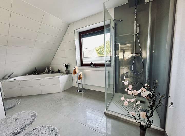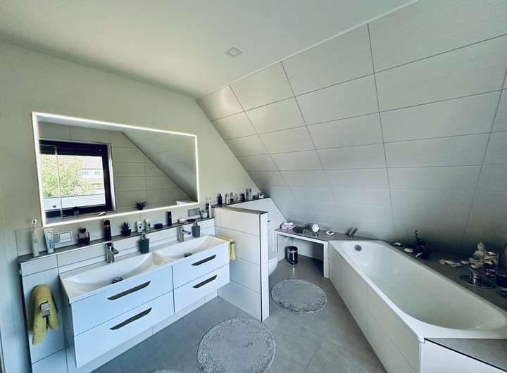 • Modernes Masterbad (2017) mit ebenerdiger Dusche, Doppelwaschbecken & Fußbodenheizung