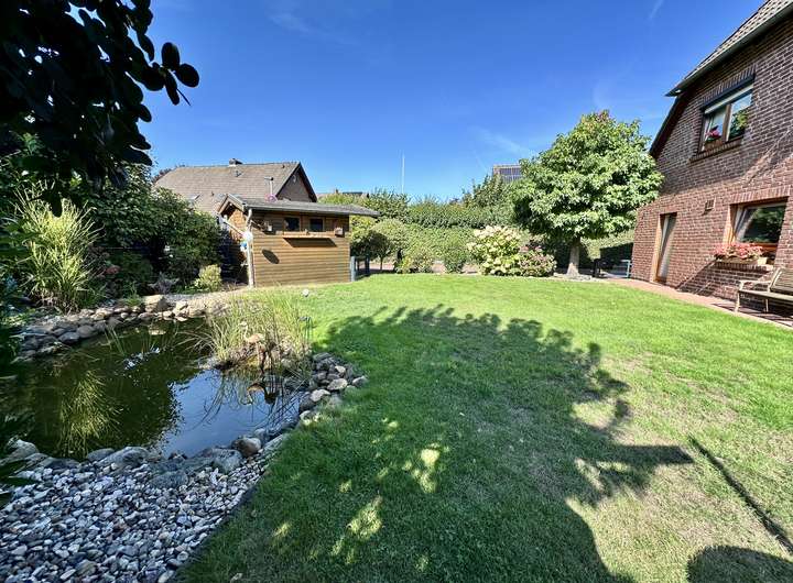 Der Garten ist eine grüne Oase – gepflegter Rasen, liebevolle Bepflanzung und ein idyllischer Gartenteich schaffen eine Atmosphäre zum Wohlfühlen. Die überdachte Terrasse mit gemütlicher Sitzecke und Außenkamin lädt zum Verweilen und Genießen ein – perfekt für lange