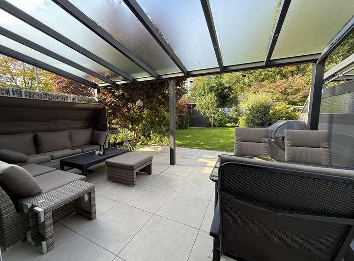 • Überdachte Terrasse mit integrierter Beleuchtung und fahrbarem Sonnenschutz – ganzjährig nutzbar