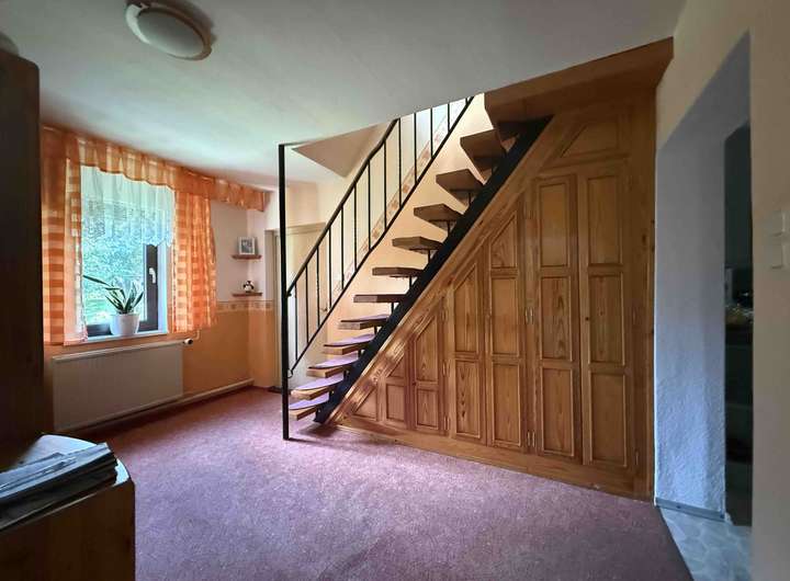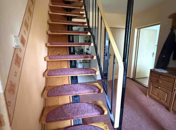 Über eine Echtholztreppe gelangt man in das Obergeschoss.