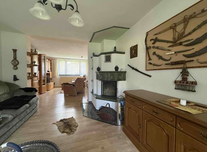 Zusätzlich lässt ein Kamin im ca. 30 m² großen Wohnzimmer die kalten Wintertage bei einem Glas Rotwein genießen.