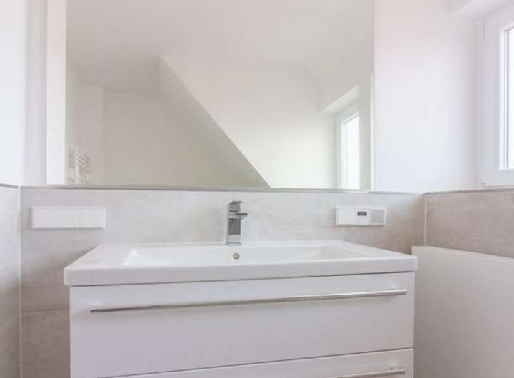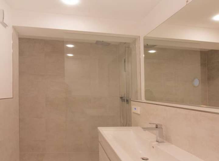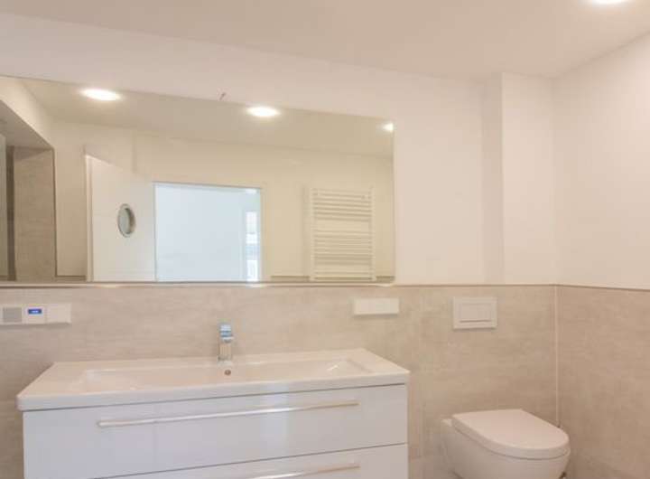 - Bad: Waschtisch mit Unterschrank, Handtuchheizkörper, ebenerdig gefliester Dusche, neues WC, Feinsteinzeug, großer Spiegel mit indirekter Beleuchtung, Radio
