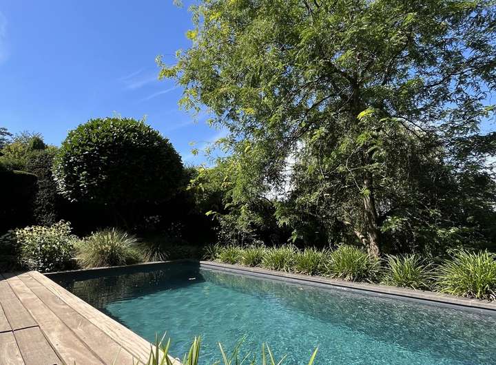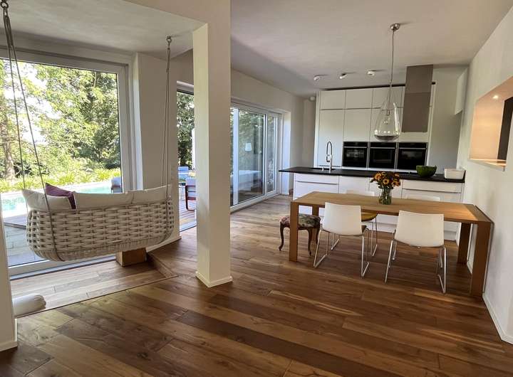 Dieses Anwesen ist mehr als ein Haus - es ist ein bewusst gestalteter Lebensraum, in dem Architektur, Natur und Stille ein harmonisches Ganzes bilden. Bodentiefe Fenster öffnen den Blick in den Garten, auf das glitzernde Wasser des Naturpools und die umgebende Vegetation. Ein Atemzug - und der Alltag fällt ab.