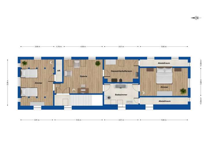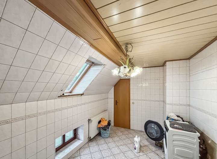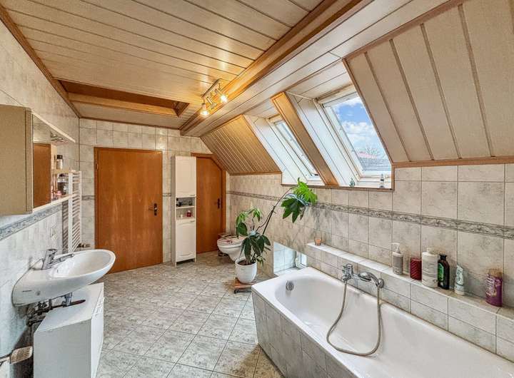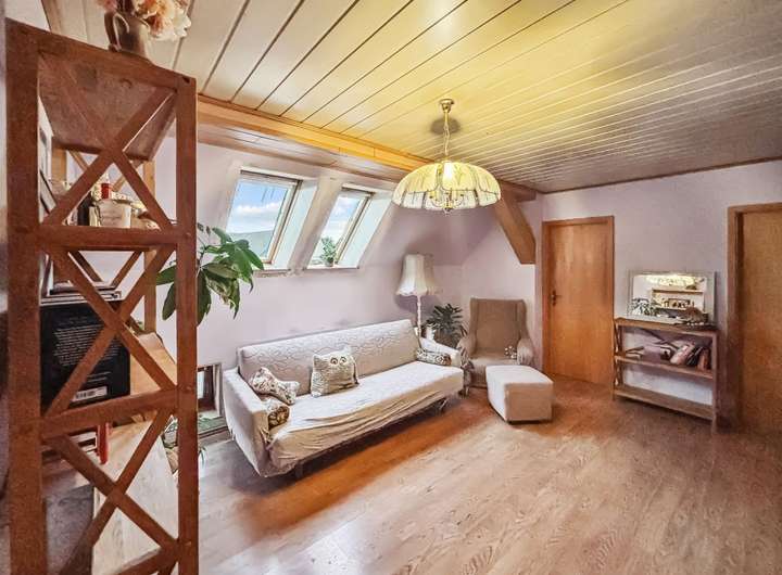 Im ausgebauten Dachgeschoss finden Sie das Schlafzimmer, welches mit offenen Balken, integrierten Wandschränken und einem begehbaren Kleiderschrank glänzt. Die helle Galerie dient ideal als Arbeitszimmer oder als Rückzugsort zum gemütlichen Verweilen. Das Tageslichtbad ist funktional gestaltet und bietet eine helle und angenehme Atmosphäre.