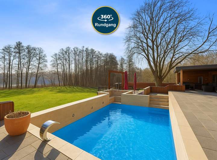 Besonders hervorzuheben ist der weitläufige Außenbereich: Auf einem ca. 3.300 m² großen Grundstück genießen Sie absolute Privatsphäre, einen direkten Zugang zum Summter See und einen spektakulären Seeblick. Die überdachte Terrasse mit Außenkino lädt zu unvergesslichen Filmabenden unter freiem Himmel ein, während der große, beheizte Außenpool für erfrischende Momente sorgt. Eine elektrische Terrassenöffnung und die energieeffiziente Bauweise des Hauses unterstreichen den durchdachten, modernen Lebensstil, den diese Immobilie verkörpert.