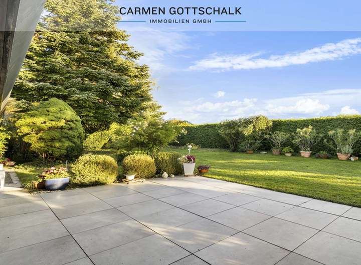 Besonders hervorzuheben ist der offene Wohnbereich mit seiner imposanten Deckenhöhe und den großen Fensterfronten, die eine helle und einladende Atmosphäre schaffen. Von hier aus genießen Sie Zugang zur sonnigen Südterrasse und dem Westbalkon mit Ausblick ins Grüne.