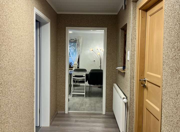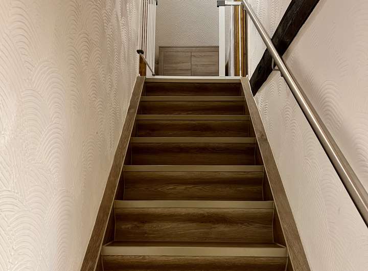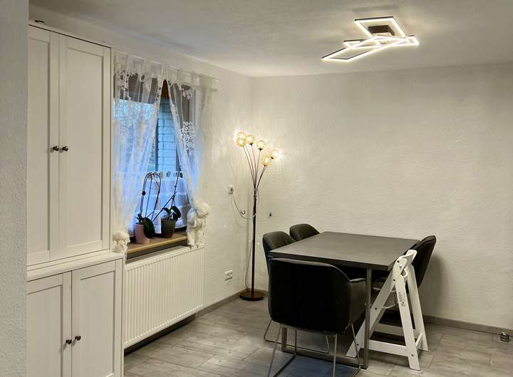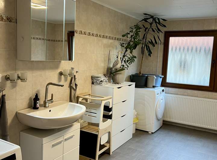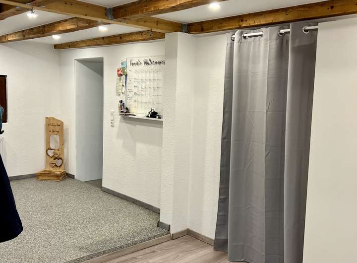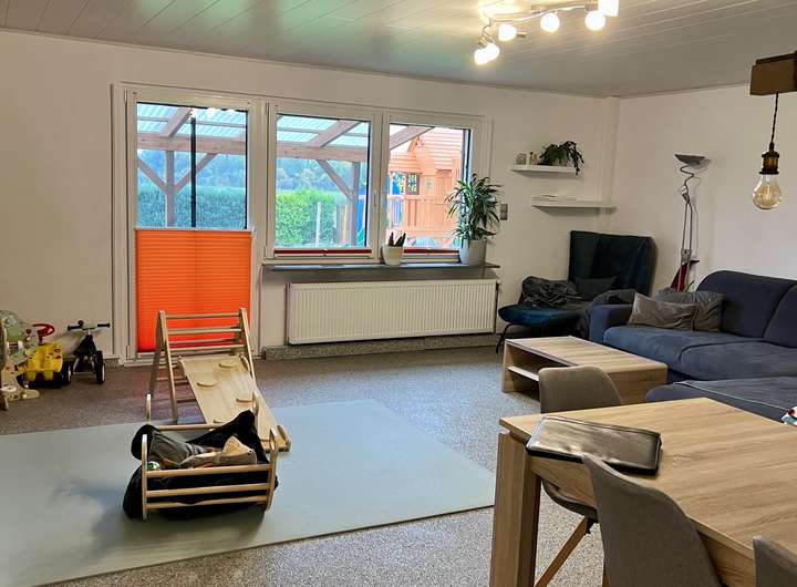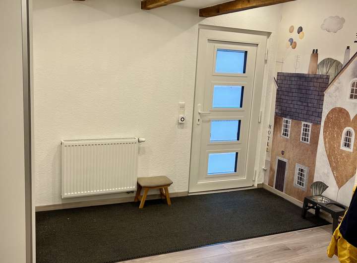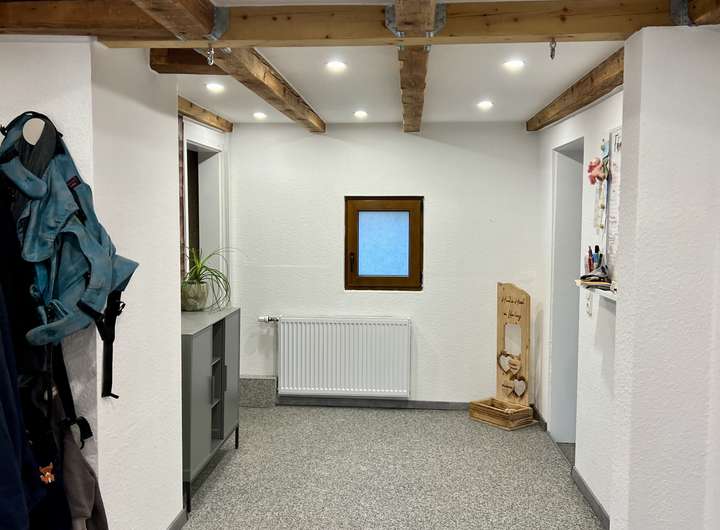 Vom Eingang im Erdgeschoss gelangt man in den großzügigen Eingangsbereich. Von hier geht es in den kleinen Keller, ins große Wohnzimmer mit Zugang zum Garten und in einen weiteren Flur der in das große Bad und in die Wohnküche im Erdgeschoss führt.
