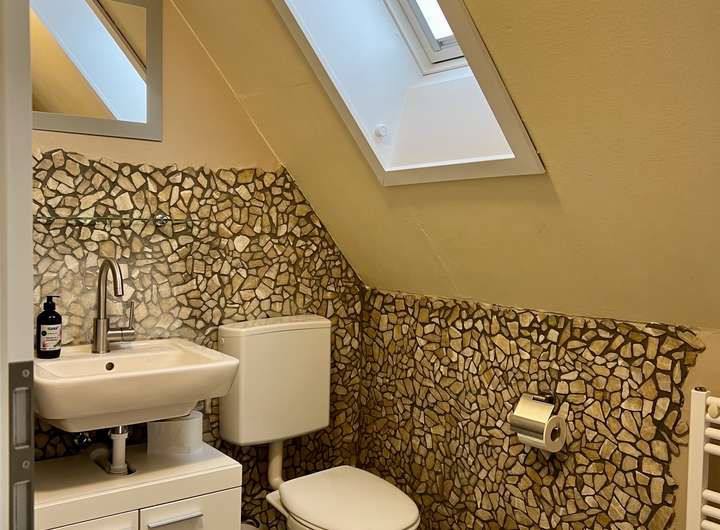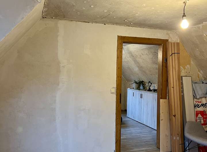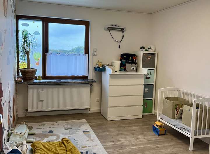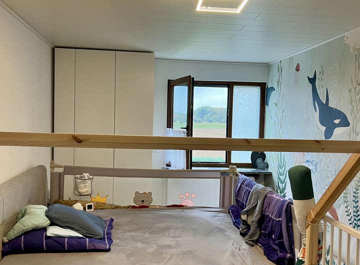 Im Dachgeschoss kommt man vom Flur in ein Durchgangszimmer (Büroraum) und danach ins Elternschlafzimmer. Diese Räume bieten noch die Möglichkeit der persönlichen Gestaltung. Auf der anderen Seite des Flures gelangt man ins kleine Bad und in die 2 Kinderzimmer.