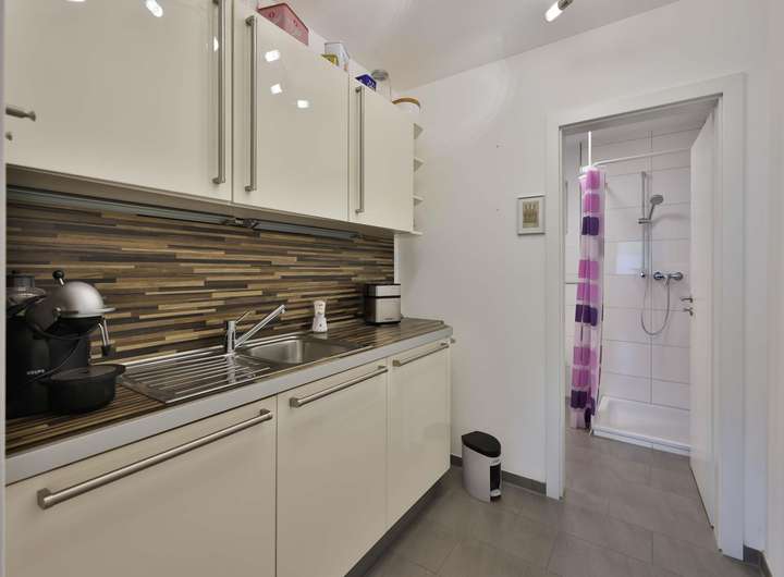Das Souterrain verfügt über eine eigenständige Wohneinheit mit kombiniertem Wohn-, Schlaf- und Essbereich, einer separaten Küche sowie einem eigenen Badezimmer mit Dusche.