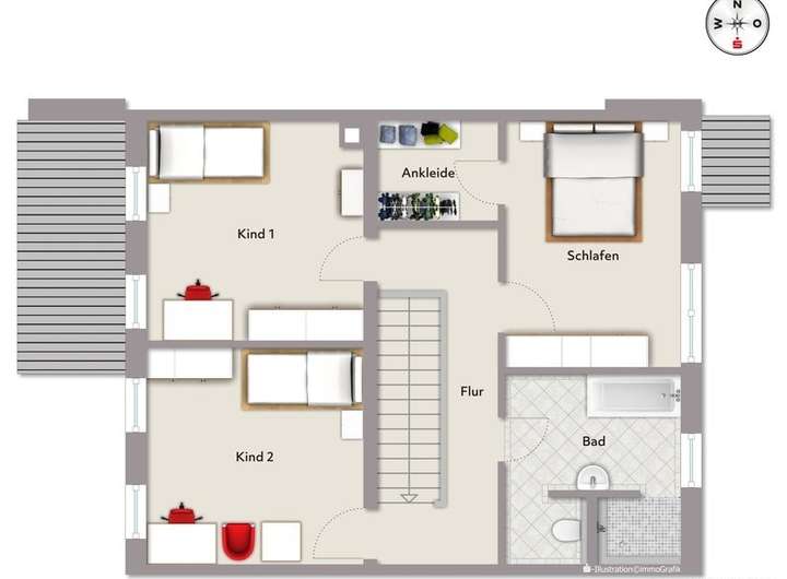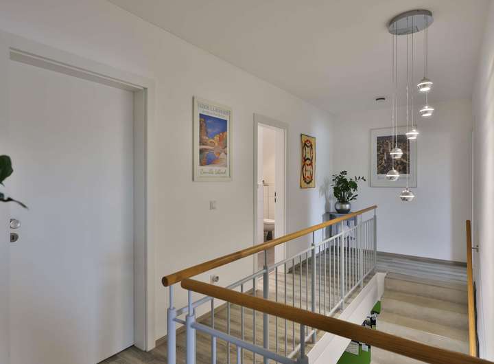 Im Obergeschoss erwarten Sie zwei helle Kinderzimmer sowie ein Elternschlafzimmer mit einer angrenzenden, separaten Ankleide.
