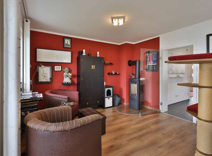 Im Erdgeschoss befindet sich eine großzügige Wohnküche mit ausreichend Platz für einen Essbereich. Direkt anschließend liegt das helle Wohnzimmer, das mit einem Schwedenofen ausgestattet ist und Gemütlichkeit sowie eine angenehme Wohnatmosphäre schafft.