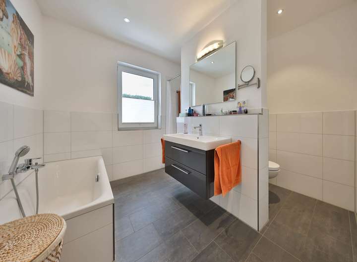 Das stilvoll und modern gestaltete Tageslichtbad bietet eine Badewanne, eine begehbare Dusche sowie ein WC und einen Waschtisch.