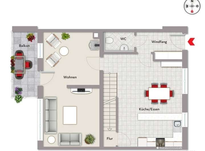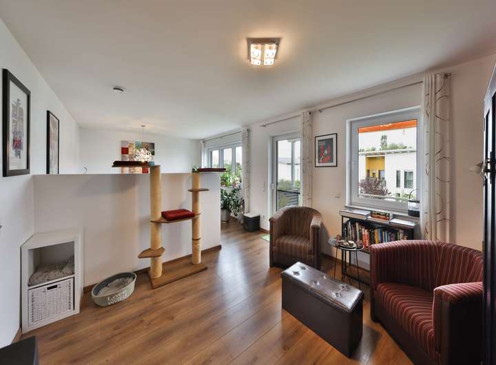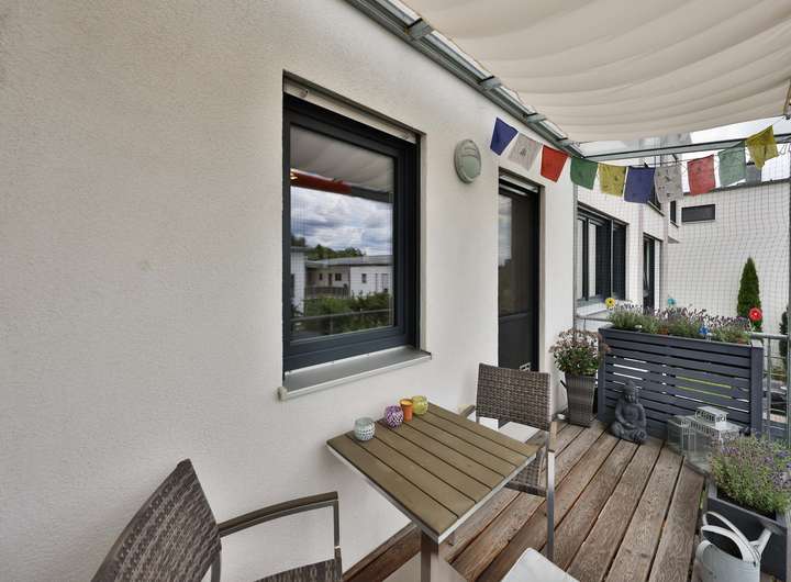 Vom Wohnzimmer aus gelangt man auf den westlich ausgerichteten Balkon, der vollständig überdacht ist und über einen textilen Sonnenschutz verfügt – ideal für entspannte Abendstunden. Zudem gibt es bereits ein Fundament für eine Wendeltreppe in den Garten.