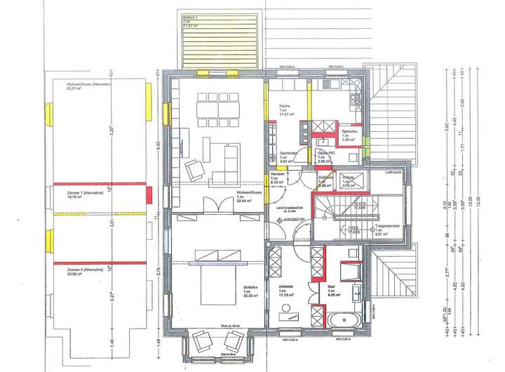 Es liegen bereits fertige Architektenpläne für die Erweiterung mit insgesamt 3 Wohneinheiten mit einer Wohnfläche von dann ca. 360 m² vor. Zusätzlich steht Ihnen ein Kellergeschoss mit einer Deckenhöhe von ca. 2,30 m und einer Nutzfläche von ca. 130 m² zur Verfügung.